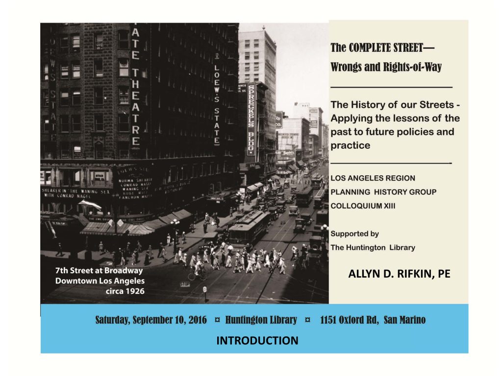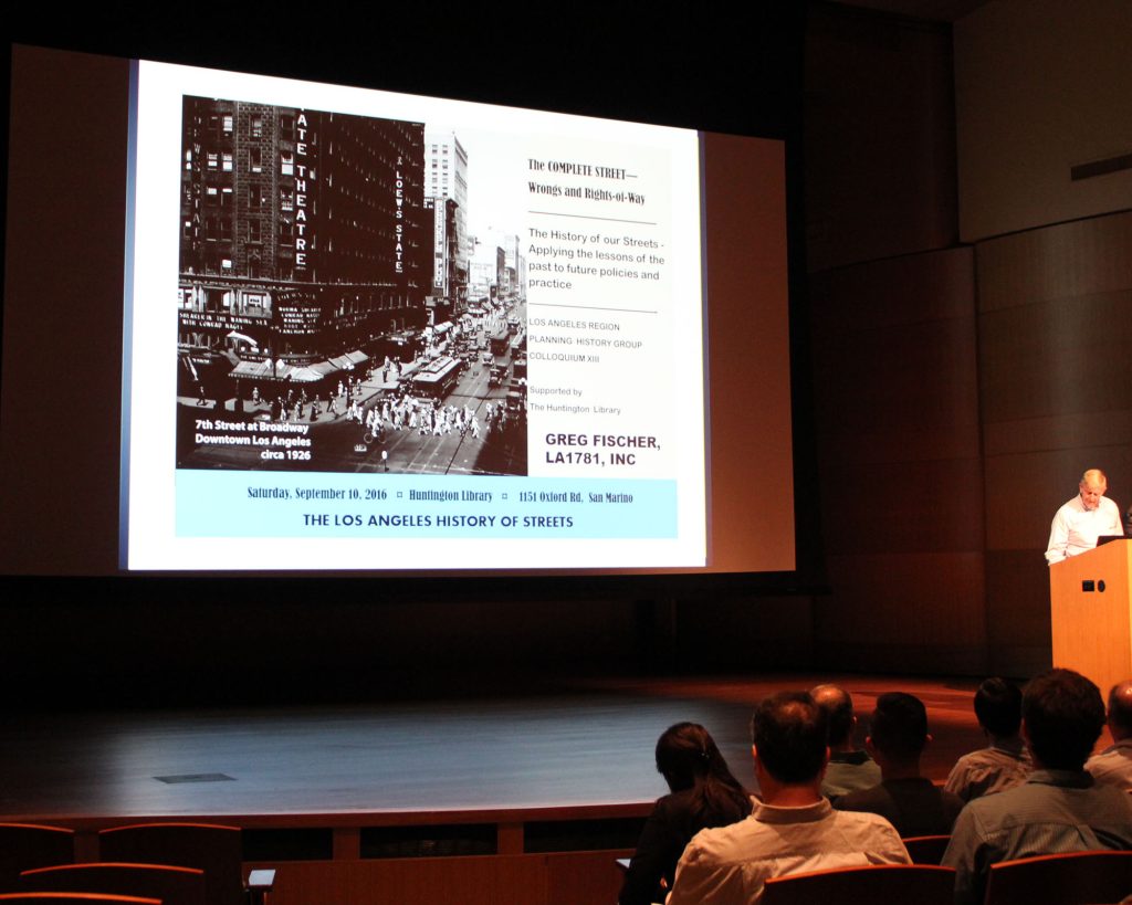 “The Complete Street: Wrongs and Rights of Way”: The Los Angeles Region Planning History Group presents a symposium examining the Complete Streets movement. Speakers discuss how urban planners are exploring ways to recapture the public rights of way for pedestrians, bicycles, and public transit (listen on SoundCloud or iTunes U). The symposium was held at The Huntington on Sept. 10, 2016.
