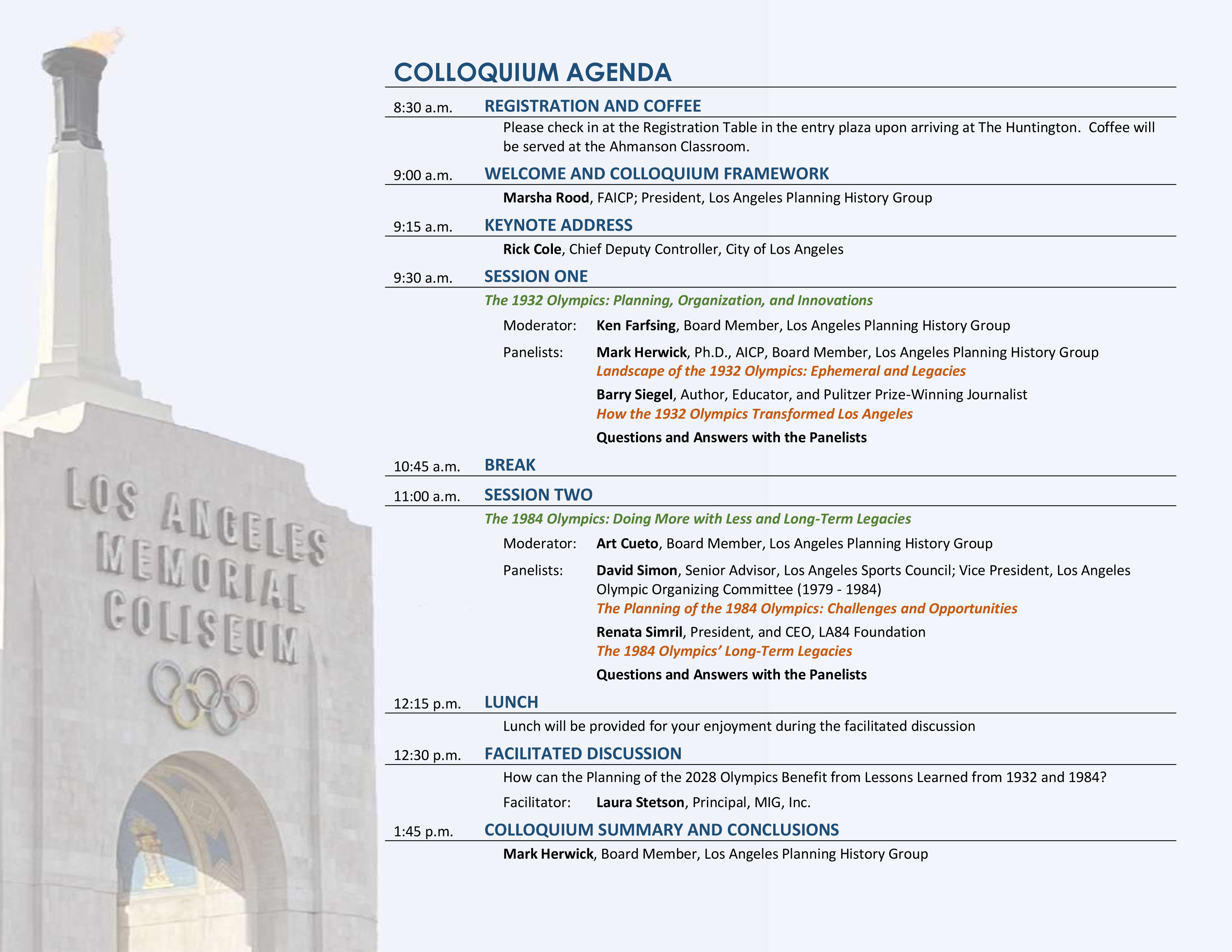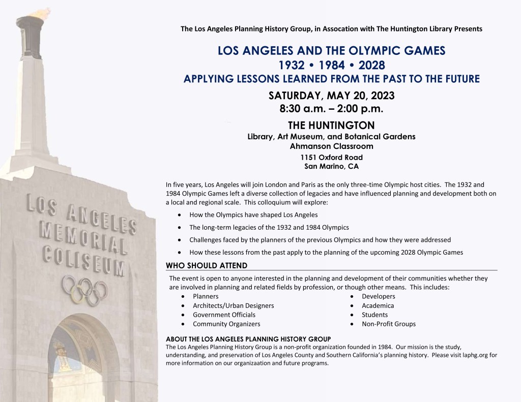 The Los Angeles Planning History Group is getting back to its program of live, in-person events at the Huntington Library with a panel discussion of “Los Angeles and the Olympic Games – 1932-1984-2028 Applying Lessons Learned from the Past to the Future.